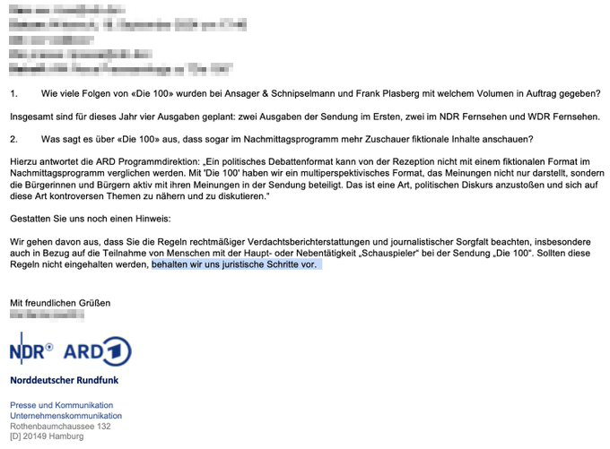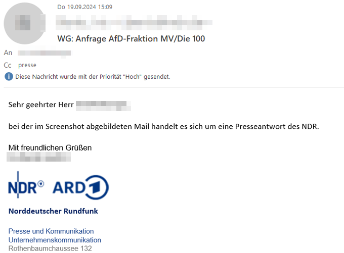 Presseanfrage an den NDR und Verifizierung durch den NDR: