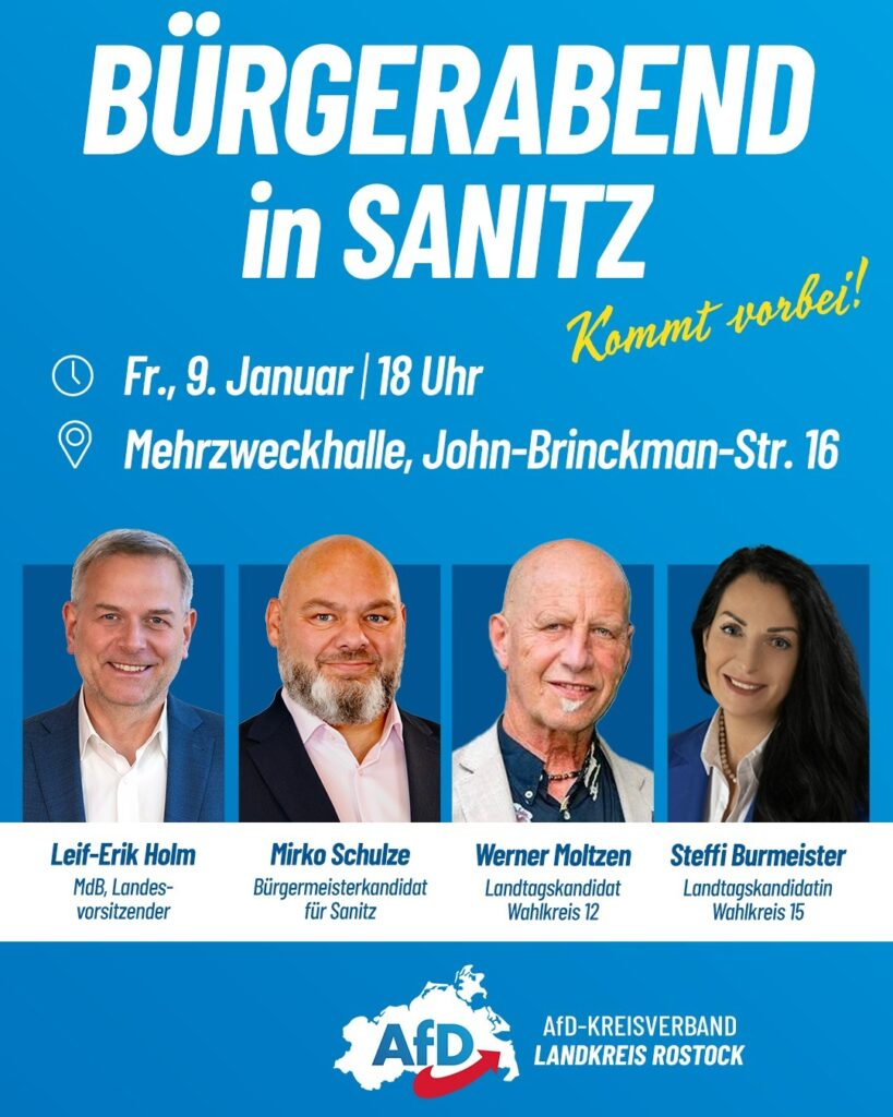 Leif-Erik Holm (MdB), Mirko Schulze (Bürgermeisterkandidat Sanitz), Werner Moltzen (Landtagskandidat Wahlkreis 12), Steffi Burmeister (Landtagskandidatin Wahlkreis 15)