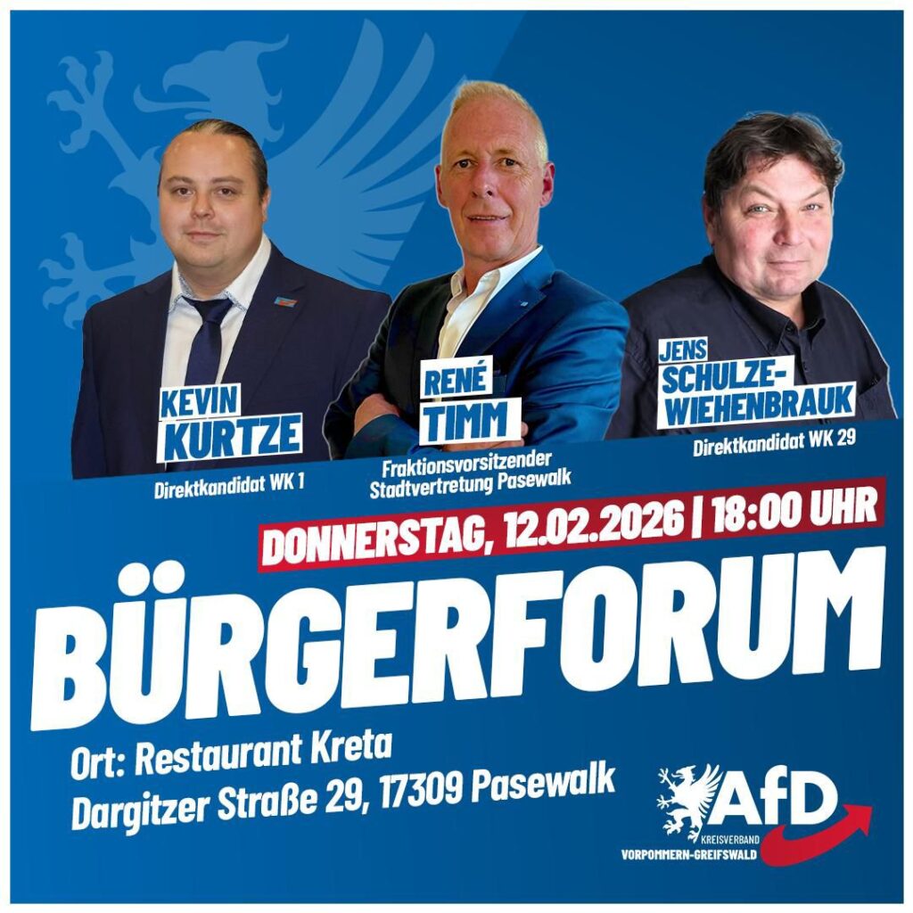 Kevin Kurtze (Landtagskandidat), René Timm (Fraktionsvorsitzender Stadtvertretung Pasewalk), Jens Schulze-Wiehenbrauk (Landtagskandidat)